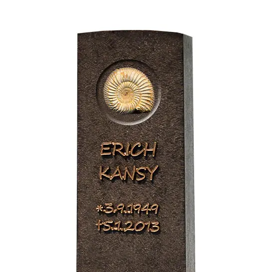 Stelenförmiger Gedenkstein für ein Doppelgrab mit sich nach oben hin verjüngendem Schaft. Kopfseitig endet dieser in einer leichten Bogenform. Ein in die Oberfläche des Granites eingelassener Ammonit aus behauenem Kalkstein kontrastiert deutlich zum dunklen Granit. Eine feine handwerklich aufgebrachte Textur lässt die Oberfläche des Grabsteins im Sonnenlich samtig scheinen. Die Bronze Inschrift ist optional. Wahlweise sind weitere Schrifttypen oder auch eine Gravur zur Beschriftung möglich.