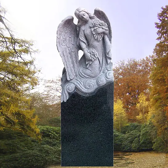 Ein von Meisterhand liebevoll und detailreich ausgearbeiteter Grabengel wächst aus einer polierten Granittafel empor. An Symbolgehalt und Ausdruck kaum zu übertreffen, ist dieser Engelgrabstein ein würdevolles Grabdenkmal nicht nur für ein Doppelgrab.
