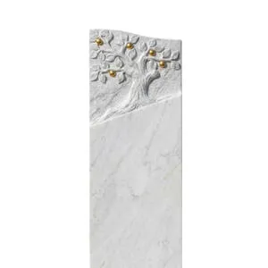Dieser schöne Grabstein für ein Doppelgrab besticht durch ein kunstvoll heraus gearbeitetes Relief mit Baummotiv, das die Schrifttafel des Steins stilvoll rahmt. Sowohl auf Einzelgräbern als auch auf einem Doppelgrab setzt dieses Grabdenkmal würdevolle Akzente.
