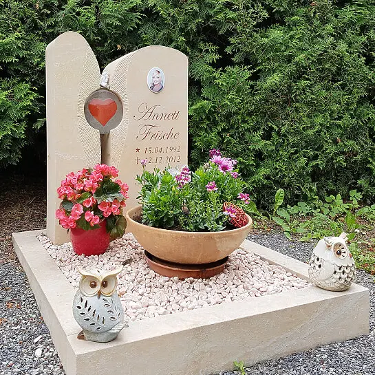 inzwischen wurde das Grabmal gesetzt und wir haben das Grab dazu entsprechend bepflanzt. Wir waren mit der Zusammenarbeit, der Abwicklung sowie der Anfertigung von ihrer Seite sehr zufrieden. Wir können Sie jederzeit weiterempfehlen. Die Grabstätte ist schon mehrmals positiv aufgefallen und als sehr schön bewundert worden, da der Stein sich von den herkömmlichen Grabmalen abhebt. Wir haben Ihnen zwei Fotos dazu angehängt.