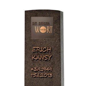 Schlichter Grabstein für ein Urnengrab mit schlankem Schaft, der sich nach oben verjüngt und mit einem leichten Bogen dezent abschließt. Der schwarze Granit wird durch eine raffiniert in die Oberfläche eingearbeitete Textur aufgehellt und scheint samtig im Sonnenlicht. Im Zusammenspiel mit mit dem Sonnelicht entsteht ein edles Farbenspiel zwischen Naturstein und Bronze. Wahlweise kann die Platte auch mit einem individuellen Spruch oder Motiv gestaltet werden.