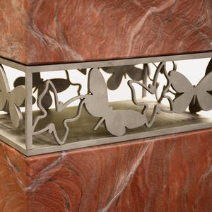 Moderne, zeitlose Grabstein Komposition aus edlem rötlichem Naturstein und seidenmatt gebürstetem Edelstahl. Kopfseitig mündet der Grabstein in ein rechteckiges Ornament mit Schmetterlingen, das als Rahmen die vertikale Form des Einzelgrabsteins unterbricht. Das Edelstahlband wird fix mit den beiden Natursteinteilen verbunden. Im Kontext von Licht und Schatten entsteht ein wundervolles Denkmal als würdiger Lebensabschluss für einen geliebten Menschen.