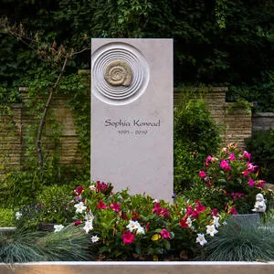 Heller Kalkstein in Kombination mit einem ockerfarbenen Ammoniten verleihen dieser modernen Urnengrab Grabmalkomposition einen besonderen Charme. Das Symbol des Lebenskreises steht für die Jahre des Lebens von der Geburt bis zum Tod des Verstorbenen. Der Kontrast zwischen hellem Kalkstein und dunkleren Ammoniten stärkt den Symbolgehalt dieser bildhauerisch umgesetzten Interpretation des Lebens von der Geburt bis zum Tode.