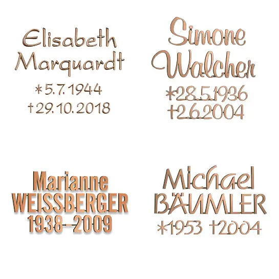 Wir erstellen Ihnen nach Auftragserteilung eine Auswahl von Schriftmustern mit Ihren persönlichen Daten zu weiteren Auswahl und Entscheidungsfindung. Hierfür haben wir für Sie die schönsten Schriftarten und Typen ausgewählt. Diese Schriftmuster senden wir Ihnen als Fotomontage auf dem von Ihnen gewählten Grabmal per Post zu. Die abschließende Schriftgestaltung erfolgt in enger Abstimmung mit Ihnen. Wir beginnen mit den Bildhauerarbeiten erst nach Abstimmung der Grabmalbeschriftung. Sollten Sie eigene Schriftarten verwenden wollen, so ist dies gerne möglich.