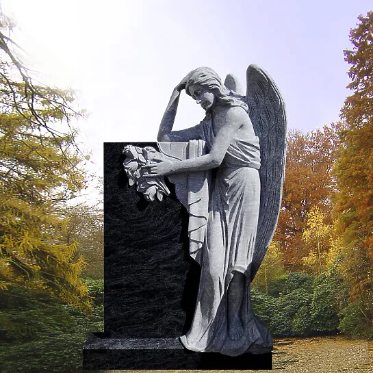 Eine von unserem Meisterbildhauer allseitig detailliert und erstklassig ausgearbeitete Engel Skulptur aus dunklem Granit wacht an einen klassischen Grabstein angelehnt über die Grabstelle. Ein solcher Engelgrabstein ist eine besonders anmutige Grabdekoration für ein individuelles Einzelgrab.
