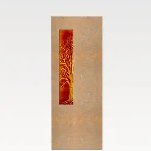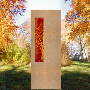 Schlichter und vertikal gestalteter Grabstein für ein Einzelgrab in einem edlen sandfarbenem, beigen Kalkstein gefertigt. Seitlich wurde ein Glaselement mit edlem Lebensbaum Motiv eingelassen. Ein Grablicht kann rückseitig zur Beleuchtung eingestellt werden. Je nach Sonnenstand leuchtet das rötliche Glasornament in unterschiedlichen Nuancen und Helligkeiten. Weitere Glas Motive aus unserem Sortiment sind möglich.
