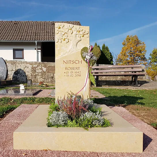 Das reizvolle Zusammenspiel monolithischer Konturen und lebendiger Reliefarbeit machen diesen stehenden Grabstein zum stilvollen Schmuck für jede Grabstelle. Der Lebensbaum als Halbrelief im Stil mittelalterlicher Lindenholzschnitzereien verleiht diesem Grabstein einen ganz besonderen Charme.
