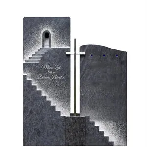 Mehrteilige Grabstein Komposition für ein Doppelgrab aus einem edlen dunklen Granit Orion gefertigt. Das Symbol der Treppe deutet auf den Lebensweg eines Menschen von der Geburt bis zum Tode. Ein handwerklich gefertigtes Kreuz aus hellem Edelstahl ist mittig auf einem kleinen Podest als Verbindungsglied zwischen den beiden Grabsteinteilen fest montiert.