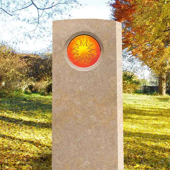 Schlichtes Einzelgrabmal mit schlankem Schaft, der sich nach oben verjüngt und mit einem leichten Bogen dezent abschließt. Die feine Maserung des edlen Kalksteins aus Portugal verleiht der Oberfläche eine sanfte Textur und Lebendigkeit. Eine durchlaufende Öffnung im Kopfbereich wird mit einem Glasornament versehen, das abhängig vom Stand der Sonne zu leuchten beginnt. Ein Grablicht kann in die Öffnung hinter das Glaselement eingestellt werden und macht diesen Grabstein insbesondere während der dunklen Jahreszeit zu etwas ganz besonderen.