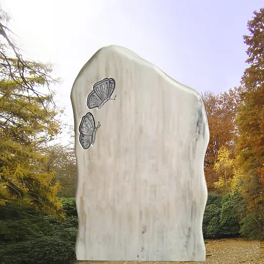 Zwei detailliert ausgearbeitete Schmetterlinge werden in diesen schönen Kindergrabstein aus Marmor eingraviert. Alle charakteristischen Feinheiten des Schmetterlingsmotivs werden von unserem Steinmetz sorgfältig auf die Schrifttafel des an den Seiten weich abgerundeten Grabsteins gebracht.