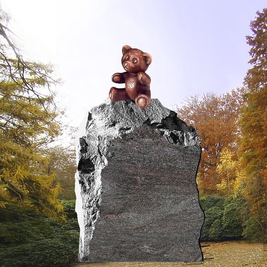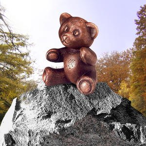 Auf einen in Felsenoptik behauenen Sockelstein montiert unser Steinmetz einen Spielzeug Teddy aus feinster Bronze. Der im traditionellen Bronzegussverfahren von Hand gefertigte Teddybär wird fest mit dem Kindergrabstein verbunden.