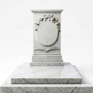 Dieser klassische, nach einer italienischen Vorlage gefertigte Marmor Doppelgrabstein besticht durch ein kunstvoll herausgearbeitetes Ornament mit einem oberseitig aufliegenden Blumenkranz und zwei unterseitig modellierten Blattdekoren, das die Schrifttafel des Steins stilvoll hervorhebt.
