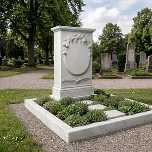 Dieser stilvolle Urnengrabstein aus portugiesischem Marmor besticht durch ein ovales und aus dem Grabstein plastisch heraustretendes Schriftfeld, das oberseitig mit einem umlaufenden Blumenschmuck und unterseitig mit einem Blattdekor nach einer klassisch - italienischen Vorlage geschmückt ist.