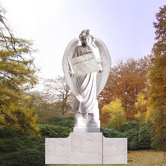 Dieser anmutige Marmor Grabstein mit Sockel wird von einer großen Engel Skulptur geschmückt. Der bis ins kleinste Detail kunstvoll ausgearbeitete Marmor Engel verleiht diesem Grabstein eine unverwechselbare Ausstrahlung.