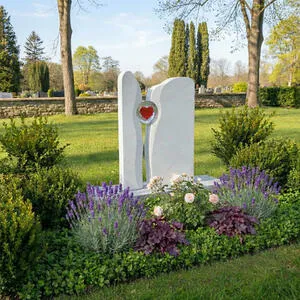 Dieses zweiteilige Urnengrabmal aus portugiesischem Marmor schließt einen edlen Glaseinsatz mit Herz zwischen den beiden Grabmalflanken ein. In traditioneller Handarbeit gefertigt, überzeugt dieses Grabmal für ein Urnengrab durch kunstvolle Gestaltung und hochwertige Materialien.