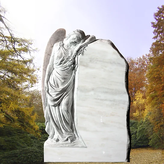 Liebevoll und in tröstliche Träume versunken lehnt ein anmutiger Engel aus feinstem Marmor an diesem pietätvollen Urnengrabstein. Die reizende Engel Skulptur wird von unserem Meisterbildhauer vollplastisch modelliert und mit einer samtenen Oberfläche stilvoll veredelt.