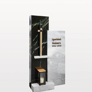 Mehrteiliges Grabstein Ensemble für ein Einzelgrab als Kombination aus hellem gräulichem Marmor Cristall T und dem grünen Picasso Verde. Ein christliches Kreuz Symbol und eine Grablaterne aus Bronze auf dem linken Grabmalteil sind fest mit dem linken Grabmalteil verbunden.