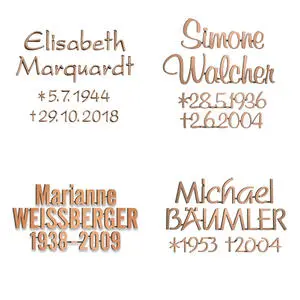 Wir erstellen Ihnen nach Auftragserteilung eine Auswahl von Schriftmustern mit Ihren persönlichen Daten zu weiteren Auswahl und Entscheidungsfindung. Hierfür haben wir für Sie die schönsten Schriftarten und Typen ausgewählt. Diese Schriftmuster senden wir Ihnen als Fotomontage auf dem von Ihnen gewählten Grabmal per Post zu. Die abschließende Schriftgestaltung erfolgt in enger Abstimmung mit Ihnen. Wir beginnen mit den Bildhauerarbeiten erst nach Abstimmung der Grabmalbeschriftung. Sollten Sie eigene Schriftarten verwenden wollen, so ist dies gerne möglich.