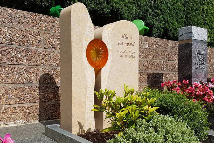 Besondere Formate des Urnengrabsteins sind der Liegestein, der Kissenstein und die Grabplatte. Moderne Urnengrabsteine werden meist als stehende Grabmale gefertigt, denn in der vertikalen Variante bieten sich dem Bildhauer mehr Möglichkeiten der Gestaltung. Und so bieten wir auch überwiegend stehende Grabsteine in modernem Design an, etwa den zweiteiligen Grabstein in der Form eines gespaltenen Felsens oder das Urnen Grabmal mit Sonne aus rotgoldenem Glasguss. Zu unseren schönsten Urnensteinen zählen kunstvolle Stein-Glas-Kompostionen, bei denen eine Kerze durch eine farbige Glaseinfassung die Urnengrabstätte sanft illuminiert. Doch auch liegende Grabsteine können kunstvoll in Szene gesetzt werden. Kleine Kissensteine in der Form eines Herzens symbolisieren die liebevolle Erinnerung an einen verstorbenen Menschen. Sie haben Fragen zu der Herstellung, der Gestaltung oder zum Preis eines modernen Urnengrabsteins? Dann kontaktieren Sie uns! Unsere Experten informieren Sie gern über unsere Produkte und Leistungen.