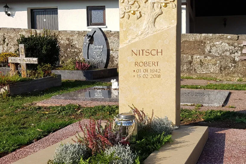 Damit das Urnengrab das ganze Jahr über gepflegt ist, kann auf Wunsch ein moderner Urnengrabstein mit passender Grabeinfassung gefertigt werden. Auch eine Grabplatte sorgt auf der Urnengrabfläche für Ordnung. Wo viele Pflanzen sind, da ist auch viel Pflege nötig. Eine pflegeleichte Grabgestaltung konzentriert sich auf eine frostsichere und witterungsbeständige Grundstruktur. Diese wird durch einen klassischen oder modernen Urnengrabstein erreicht, der bei Bedarf mit einer Grab-Umrandung aus Granit oder einem anderen robusten Material geliefert wird. Der Naturstein oder Kunststein ist leicht zu pflegen. Ein Tuch, warmes Wasser und eine kleine Bürste reichen in der Regel aus, um das Urnengrabmal und die Einfassung zu reinigen. Um der Grabstelle ein saisonal wechselndes Erscheinungsbild zu verleihen, empfiehlt sich der Kauf einer winterfesten Grabvase oder einer Grabschale, die fest auf die Steinplatte montiert wird. Auf diese Weise bleibt der Pflegeaufwand überschaubar und das Urnengrab behält dennoch das ganze Jahr über ein attraktives Erscheinungsbild. Moderne Urnengrabsteine aus Sandstein oder einem anderen Naturstein überzeugen indes allein schon mit ihrem innovativen Design. In der Form eines Buches, einer Schriftrolle oder eines Felsens gestaltet, kann auf zusätzlichen Grabschmuck getrost verzichtet werden, denn das Urnengrabmal in modernem Design ist selbst ein kleines Kunstwerk.