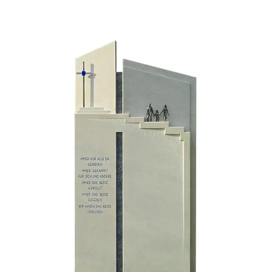 Dieser besondere Grabstein für ein Einzelgrab versinnbildlicht den gemeinsam beschrittenen Lebensweg hin zur Erlösung. Die handwerklich aus dem Kalkstein herausgearbeitete Treppe führt zu einem fest mit dem Grabstein verbundenen Edelstahl Kreuz Symbol. Eine kleine Figurengruppe mit Vater, Mutter und Kind steht symbolisch für die Gemeinschaft der Familie.