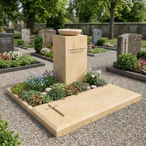 Diese würdevolle Einzelgrabanlage für eine Erdbestattung aus warmtonigem Dresdner Sandstein besticht durch ihre klare, geometrische Formensprache. Den Mittelpunkt bildet eine aufrechte, quaderförmige Stele, die dem Gedenken eine zeitlose Präsenz verleiht. Als besonderer Akzent ruht auf dem Grabstein eine flache Schale, die sich wunderbar als Vogeltränke oder als Pflanzgefäß für Sukkulenten eignet. Ein dezent an der Rückseite eingearbeitetes kleines Kupferrohr sorgt zuverlässig dafür, dass Regenwasser abfließen kann. Die längliche, liegende Grabplatte greift das edle Material harmonisch auf und ist mit einem flach aufliegenden Metallkreuz verziert. Ein L-förmiges Beet mit Lavendel und Bodendeckern rahmt die Platte ein und verleiht der Ruhestätte eine friedvolle Atmosphäre..
