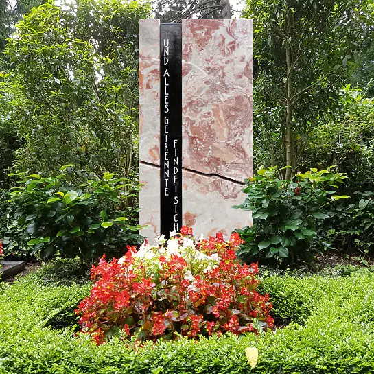 Moderner Einzelgrabstein aus feinem Lahnmarmor und zurückhaltenden kontrastierenden Akzenten aus schwarzem Granit. Die hochwertig verarbeiteten Materialien treten angesichts der schlichten Formgebung des Grabsteins in den Vordergrund und zeugen von höchster Qualität. Ein vertikales Band in schwarzem Granit dient als Fuge zwischen den beiden Grabmalteilen. Ein vertikal ausgerichteter Grabspruch stärkt die symbolhafte Bedeutung des Grabsteins.