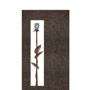 Schlichter & vertikal gestalteter Grabstein für ein Urnengrab einem edlen dunklen Granit gefertigt. Die Granit Oberfläche wurde handwerklich mit Schraffur gestaltet und schimmert samtfarben im Sonnenlicht. Die seitlliche Aussparung wurde mit einer Bronze Rose geschmückt. Rückseitig befindet sich ein Glasornament, in das die Konturen der Rose eingestrahl werden.
