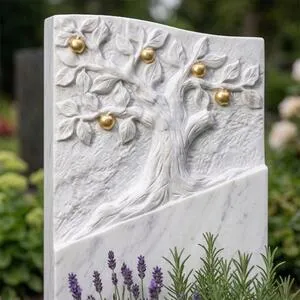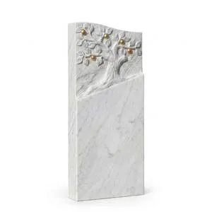 In Anlehnung an mittelalterliche Lindenholzschnitzereien wird dieser Grabstein für ein Urnengrab im Kopfbereich mit einem kunstvollen Baum Motiv verziert. Die vergoldeten Früchte des Lebensbaumes setzen reizvolle Akzente auf dem Urnengrab.