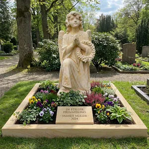 Dieser Antiker Engelgrabstein für ein Urnengrab aus Sandstein vereint stilvolle Symbolik mit traditioneller Steinmetzkunst. In unserer eigenen Fertigung in Deutschland entsteht jedes Grabmal in klassischer Handarbeit und wird mit besonderer Sorgfalt ausgearbeitet. Der Engel folgt der klassischen Vorlage eines Originals aus Wien und beeindruckt durch seine ruhige, andächtige Darstellung: in knieender Haltung, betend und mit einem Kranz in den Händen als Zeichen des liebevollen Gedenkens. Der Sockel aus hellem, warmtonigem Sandstein verleiht dem Grabstein eine harmonische Ausstrahlung und passt sich dezent an unterschiedliche Grabstätten an. Im Preis enthalten ist unser Komplettservice – inklusive professioneller Gravur der Inschrift sowie fachgerechtem Aufbau vor Ort. So erhalten Sie ein langlebiges, hochwertiges Erinnerungsmal, das Würde und Beständigkeit ausstrahlt und zugleich individuell gestaltet werden kann. Auf Wunsch beraten wir Sie persönlich zu Schriftbild, Ornamentik und passenden Maßen.