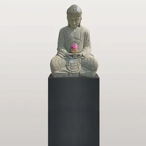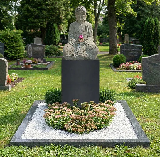 Dieser besondere Einzelgrabstein wird in eigener Produktion in Deutschland handwerklich gefertigt und verbindet hochwertige Materialien mit buddhistischer Symbolik. Der dreiteilige Sockel aus dunklem, sehr homogenem Granit bietet eine elegante Fläche für die Grabinschrift sowie optional für einen persönlichen Grabspruch und überzeugt durch seine ruhige, fein bearbeitete Oberfläche mit dauerhaft guter Lesbarkeit. Als zentrales Gestaltungselement ergänzt eine Buddha-Skulptur aus Basanit (Lavagestein) das Denkmal. Die Figur ist in perfekter Ausarbeitung im religiösen Lotussitz dargestellt und strahlt Gelassenheit, Würde und inneren Frieden aus. Die rustikale Naturstein-Textur des Basanits wirkt lebendig und setzt einen markanten Kontrast zum glatten, edlen Granit, wodurch eine harmonische Gesamtwirkung entsteht. Ideal für ein Einzelgrab, wenn ein stilvoller Erinnerungsort mit klarer Formensprache und spiritueller Tiefe gewünscht ist.