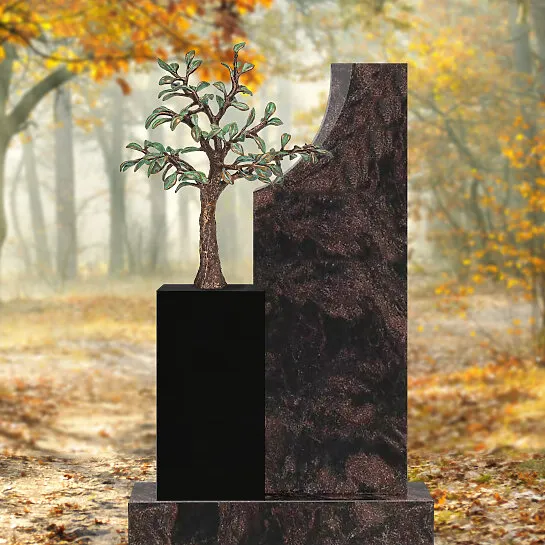 Dieses besondere Grabmal wird in eigener Produktion in Deutschland handwerklich gefertigt und eignet sich hervorragend als Doppelgrab bzw. Familiengrab mit Platz für mehrere Namen und Daten. Als zentrales Motiv setzt der Bronze Lebensbaum aus klassischem Bronzeguss einen warmen, würdevollen Akzent und steht symbolisch für Zusammenhalt, Erinnerung und den fortdauernden Kreislauf des Lebens. Die elegante Wirkung entsteht durch die hochwertige Kombination aus zwei Granitsorten (farbig und schwarz): tiefschwarzer Granit Indian Black trifft auf den farbigen Granit Aurora mit dezenter, feiner Struktur. Der Kontrast betont das Bronzemotiv besonders harmonisch und verleiht dem Grabmal eine zeitlose, moderne Ausstrahlung. Präzise Bearbeitung sorgt für klare Linien, saubere Kanten und eine langlebige, pflegeleichte Oberfläche. Optional ist ein passender Sockel erhältlich, der zusätzlichen Raum für Inschrift und persönliche Gestaltung bietet.