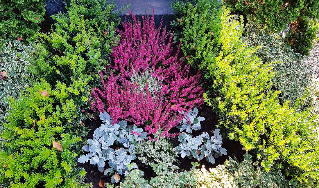 Urnengrabstein mit Schwan - Urnengrab mit sommerlicher pflegeleichter Grabbepflanzung