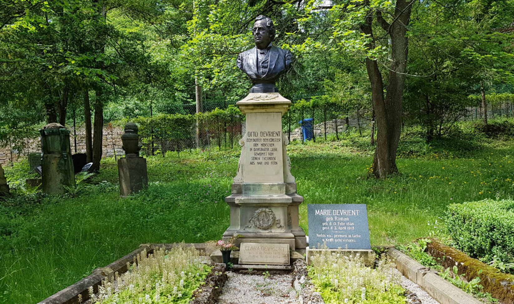 Historisches Grabmal auf einem Familiengrab aus Sandstein und Bronze in Jena auf dem Nordfriedhof