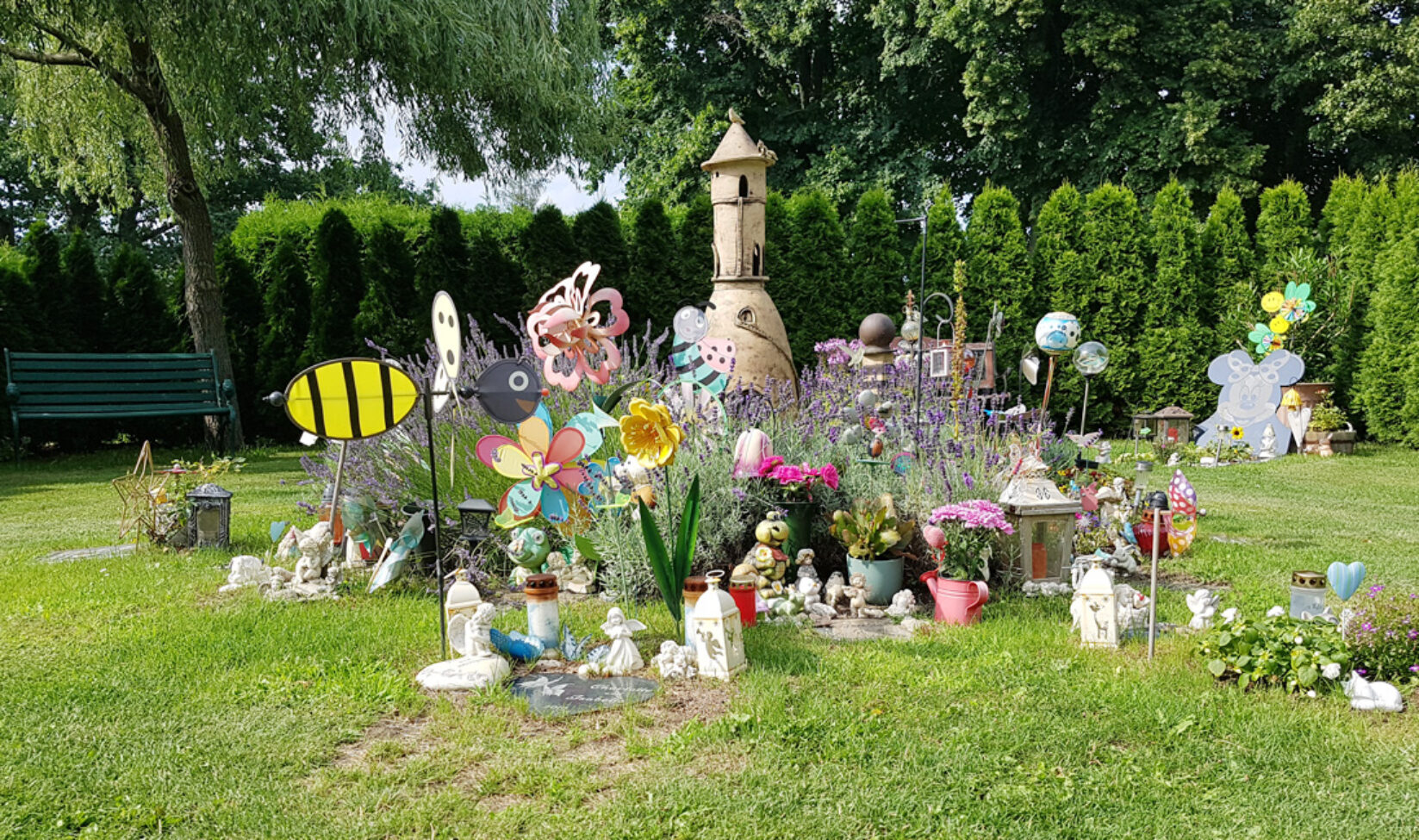 Gestaltung einer Kindergrabanlage - Grabplatten arrondiert vor einem Schloß aus Keramik - Grabschmuck & Grabbepflanzung mit Lavendel und Windspielen / Steinmetz Evangelischer Friedhof Petershagen