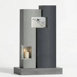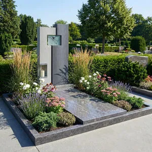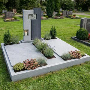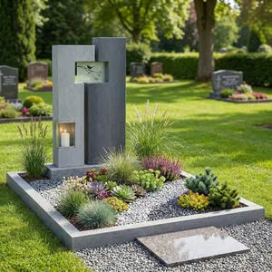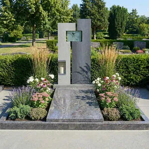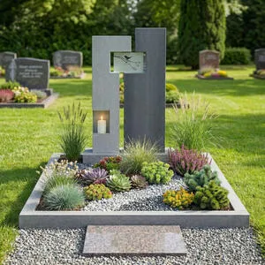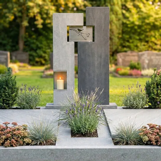 Dieser moderne Doppelgrabstein für ein Familiengrab vereint klare Linien mit hochwertigen Materialien und bietet eine stilvolle Gestaltung mit ausreichend Platz für mehrere Namen und Lebensdaten. Das Grabmaldesign aus Granit wirkt zeitlos, ruhig und besonders langlebig. Als zentrales Element ist eine Gablaterne mit integriertem Grablicht aus Edelstahl harmonisch eingebunden und sorgt bei Dämmerung für dezente, besondere Lichtakzente. Ergänzt wird das Konzept durch ein Edelstahl-Ornament mit Vogelmotiv, das individualisierbar ist und dem Grabstein eine persönliche, symbolische Note verleiht. Die edle Kombination aus Naturstein und Metall schafft eine moderne, hochwertige Gesamtwirkung und unterstreicht den repräsentativen Charakter einer Familiengrabstätte. Auf Wunsch kann der Doppelgrabstein mit einem passenden Natursteinsockel ausgeführt werden, um die Proportionen zu betonen und zusätzliche Gestaltungsmöglichkeiten zu eröffnen. Ideal für alle, die ein elegantes, pflegeleichtes und individuell anpassbares Grabmal mit Licht- und Designelementen wünschen.