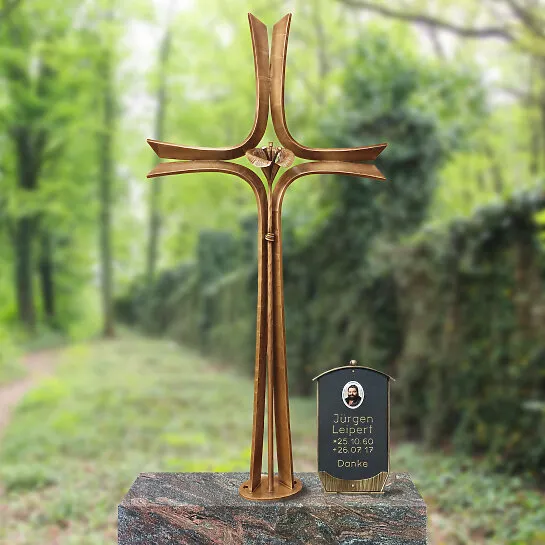 Dieses exklusive Grabkreuz für klassische Einzelgräber vereint meisterhafte Schmiedekunst mit der Eleganz von Naturstein. Das aus hochwertiger, geschmiedeter Bronze gefertigte Kreuz besticht durch seine ausdrucksstarke, nach außen geschwungene Linienführung. Im Zentrum der aufstrebenden Bronzeelemente ruht eine detailreich ausgearbeitete, plastische Blüte, die dem anspruchsvollen Design handwerkliche Tiefe verleiht. Die warme, bräunlich patinierte Oberfläche der Bronze gewährleistet höchste Witterungsbeständigkeit und eine langlebige, edle Optik. Getragen wird das Kunstwerk von einem massiven, handwerklich perfekt verarbeiteten Sockel aus Himalaya-Granit. Dieser Premium-Naturstein besticht durch seine rötlich-graue bis schwarze Strukturierung, die jedes Stück zum Unikat macht. Die harmonische Materialkombination aus kunstvoll geschmiedeter Bronze und lebhaftem Granit bietet eine erhabene Gestaltungslösung, die einer traditionellen Erdbestattung einen äußerst würdevollen und beständigen Rahmen verleiht.